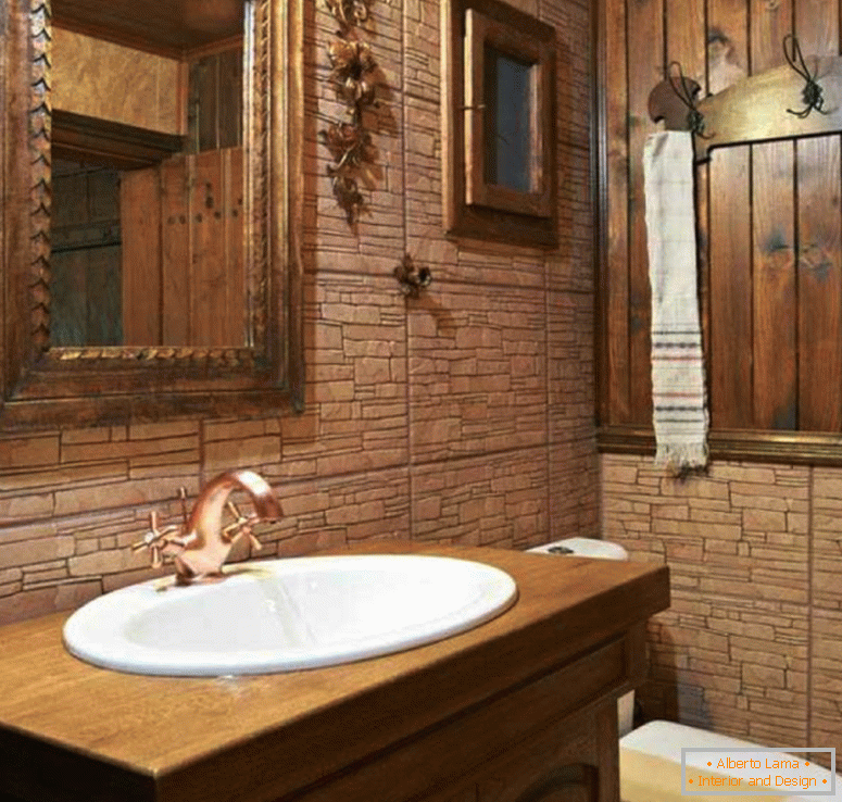 Debido al hecho de que la sala de estar está terminada con madera, así como el exterior de la casa, parece que se encuentra fuera del edificio. Desde el césped verde solo está separado por una pared de vidrio. El baño también tiene muebles de madera y una gran ventana que da a la terraza.