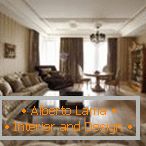 En la sala de estar coloca un mínimo de muebles necesarios. Es suficiente para un par de sillones y un amplio y amplio sofá, que también se transforma en un lugar para dormir para los huéspedes finales. Una mesa de centro baja con una superficie de vidrio y patas de metal se coloca en una esquina separada, al lado de la estantería de libros.