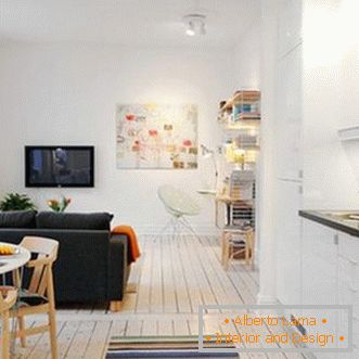 - Instalación de particiones. El método más obvio para delimitar zonas, que los diseñadores modernos utilizan de forma creativa. Como particiones, aplican los elementos de decoración presentes en la sala. Con la función de dividir las zonas, el contador de barras está bien. Además, una esquina de la cocina se puede dividir en partes.