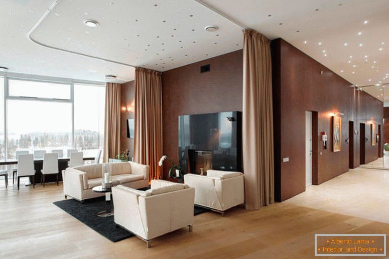 La habitación, decorada con cortinas correderas, se ve moderna y muy inusual. Los sistemas con cortinas móviles son una cornisa especial con varias ranuras, en las cuales se instalan los listones con largas piezas de telas. Su ancho es generalmente de 0.5 a 0.9 metros. Adecuado para montar marcos superiores que tienen una altura desde el suelo hasta el techo. También se usa para zonas de zonificación conectadas a una galería. El movimiento del lienzo se realiza manual o automáticamente (controlado por el control remoto). Las telas pueden ser monofónicas, incluyen una variedad de patrones. Dichos sistemas son atractivos y diversos, y fáciles de usar. Mover tiras de tela en diferentes direcciones puede lograr una iluminación natural óptima en cualquier momento del día. Y por la noche cerrarán perfectamente la habitación de miradas indiscretas.