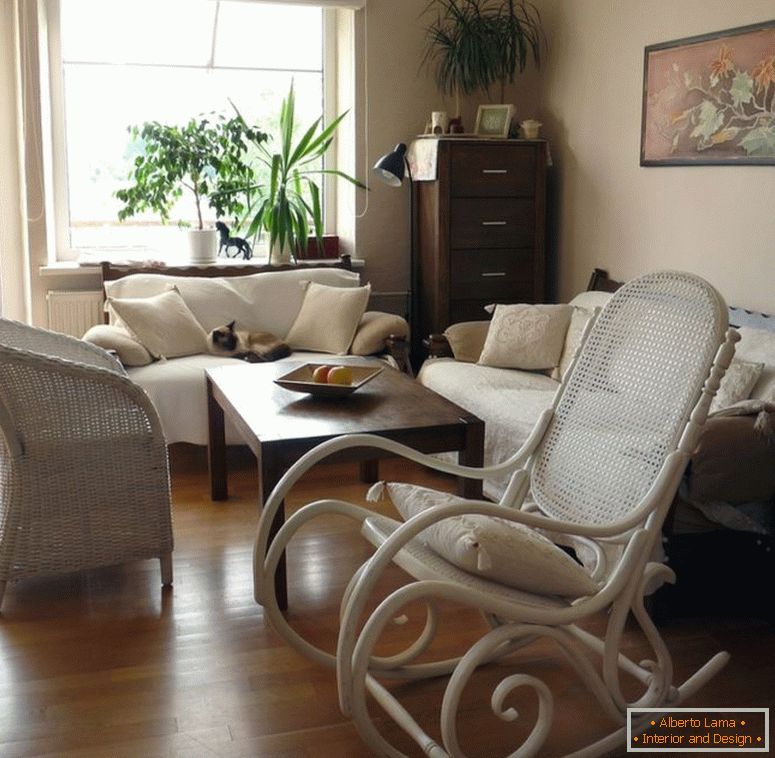 Muebles tapizados, para no cargar decoraciones, es mejor comprar tonos pastel. Y las sillas, taburetes, mesas y elementos decorativos deben estar en armonía con las paredes y unir todo el interior. El conjunto de muebles en sí no es necesariamente elegante y caro, puede comprar análogos más democráticos. Mire la mesa de centro pintada, la mesita de noche debajo de la pantalla de televisión, estantes para libros de IKEA, auriculares baratos y una cómoda común para un dormitorio.